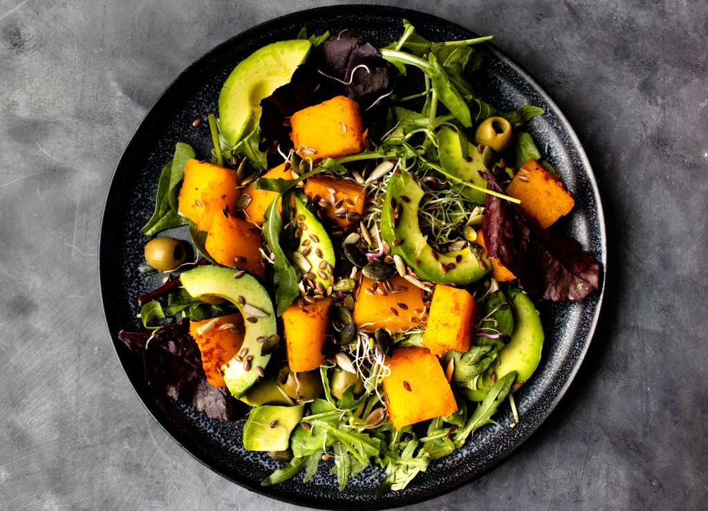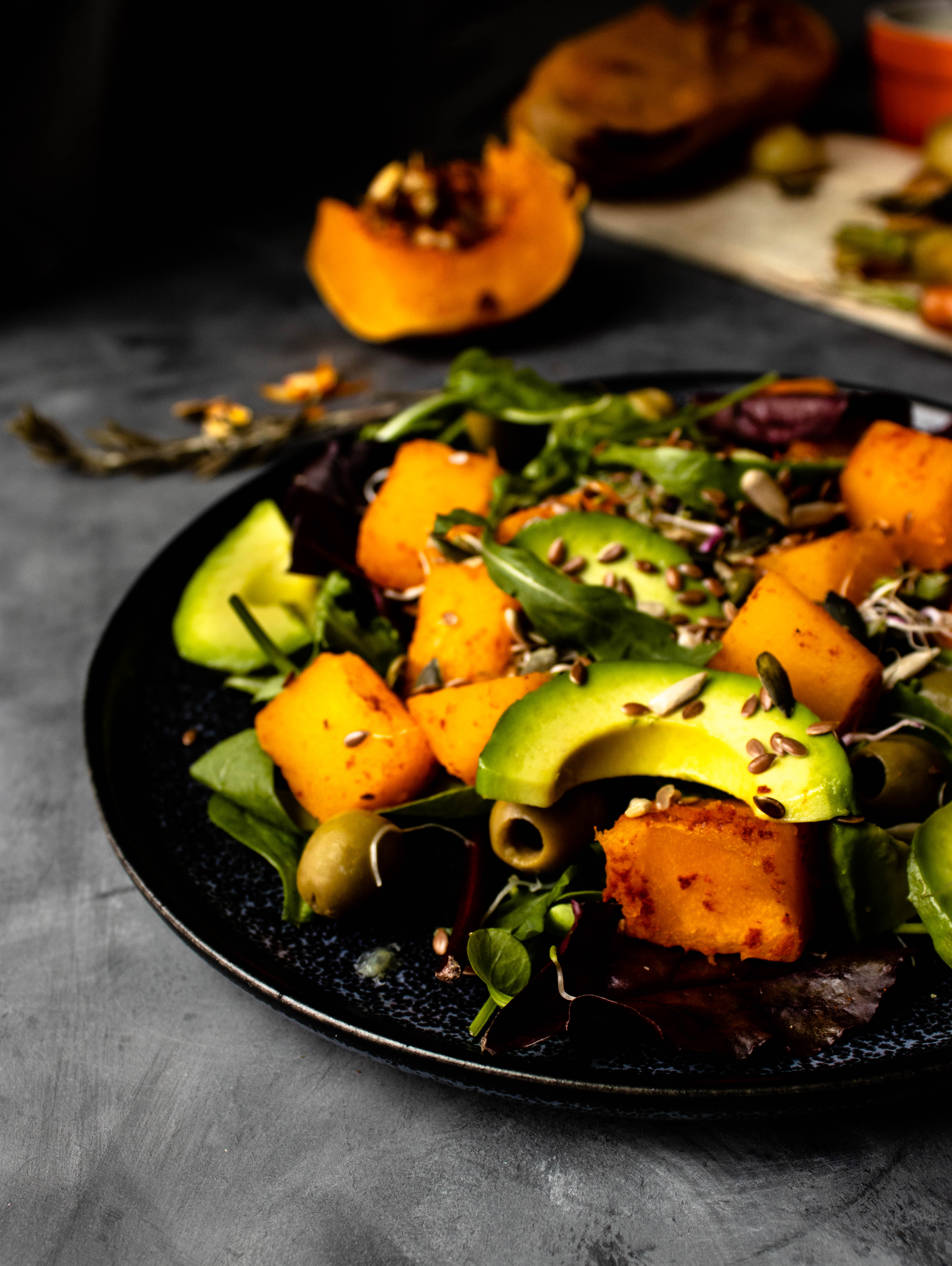 Pyszna i lekka sałatka z dynią, z dodatkiem awokado i oliwek.