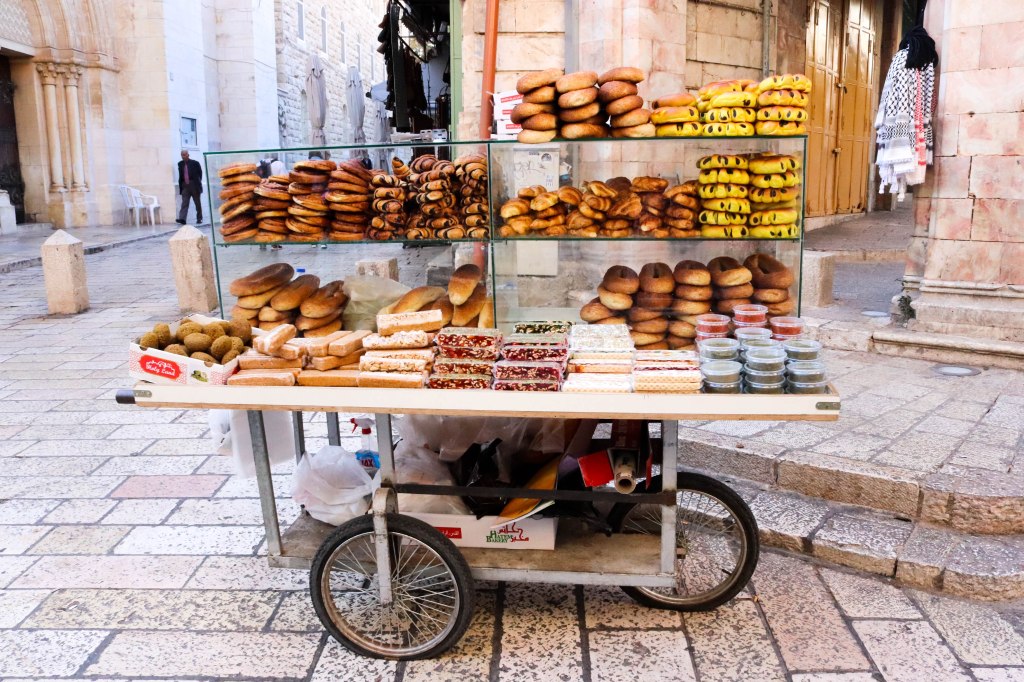 Na zdjęciu powyżej mamy przykład przenośnego straganu z pieczywem. To zdjęcie zostało wykonane na Starym Mieście w Jerozolimie, nieopodal Bazyliki Grobu Świętego. Po drodze na zwiedzanie Grobu warto złapać rogala, gdyż kolejki do zwiedzania tego konkretnego, jak i wszystkich innych miejsc świętych bywają bardzo długie…