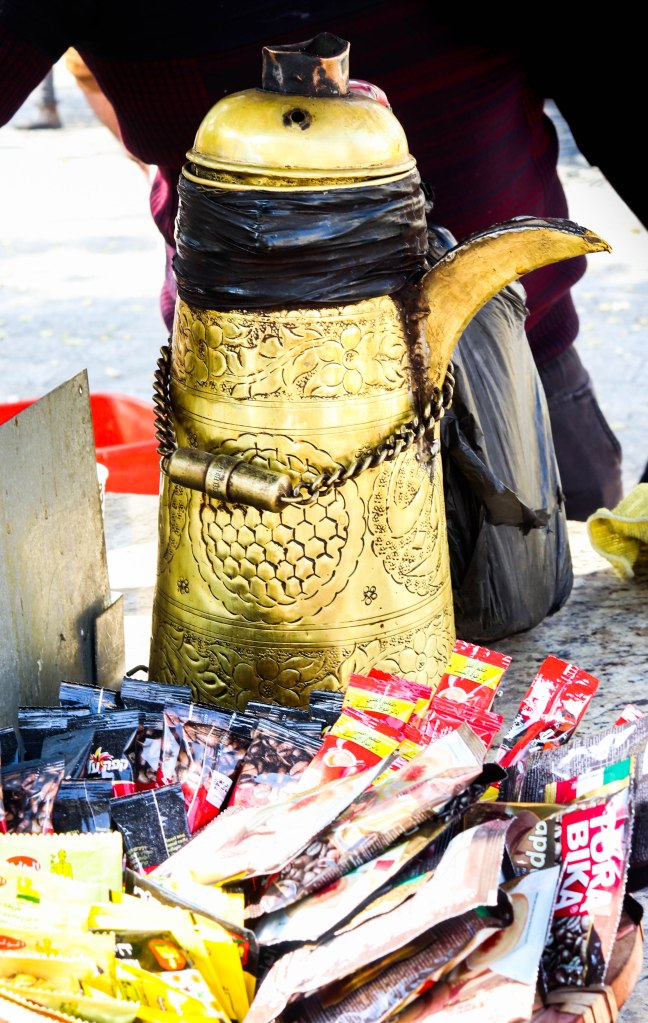 Kawa. Pyszna, czarna, przyprawiona kardamonem, prosto z zaparzacza takiego jak na zdjęciu – zdecydowanie polecam tym, którzy lubią małą czarną. W bardziej tradycyjnych częściach miast próżno szukać popularnych kawiarnianych sieciówek (i całe szczęście). Powyższe zdjęcie wykonane zostało w Betlejem – taka kawa kupiona wprost od sprzedawcy na ulicy to koszt kilku szekli. Jest klimacik.