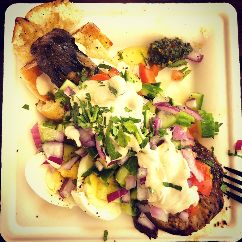 Sabich to kolejne typowe danie kuchni izraelskiej, bardzo popularny street food. Jest to połączenie smażonego bakłażana, jajka na twardo, hummusu i innych dodatków, m.in. sałatki izraelskiej (cebula, pomidor, ogórek) i sosu tahini. Najczęściej podawany jest w formie kanapki, w chlebku pita, ale można go dostać również w innej, mniej tradycyjnej wersji, jak na zdjęciu poniżej. Super opcja dla wegetarian – smaczne, pożywne i sycące danie.